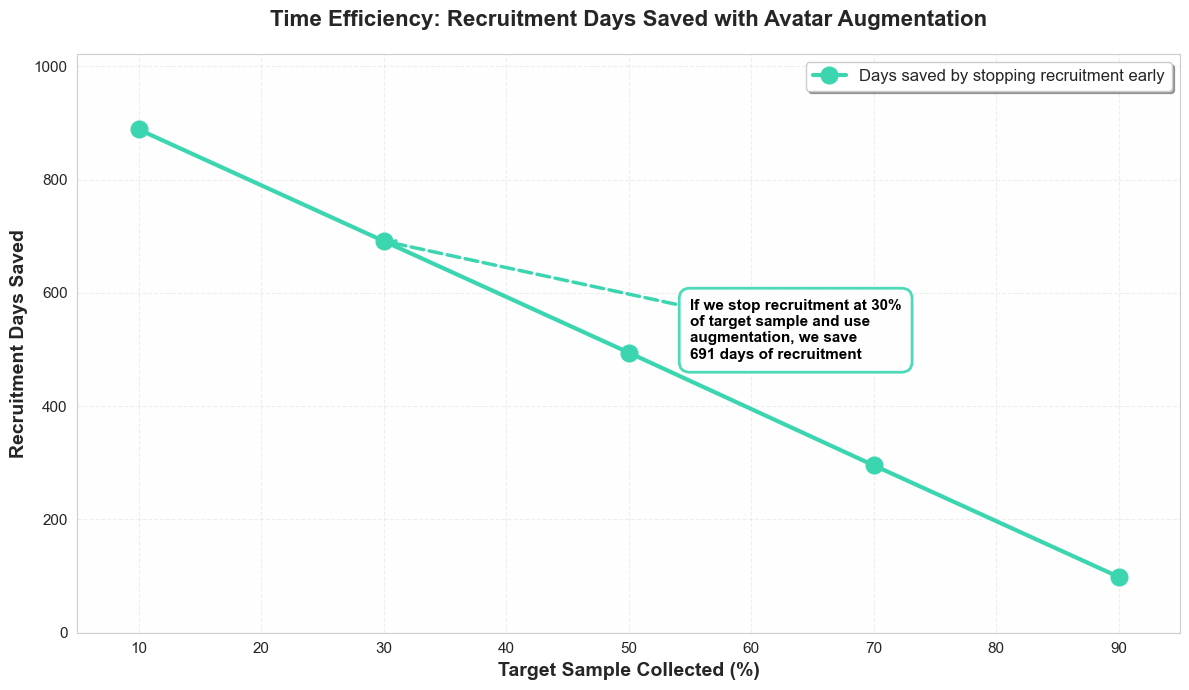 Time is money, and recruiting data requires a lot of time. This graph shows the potential time savings resulting from the use of an augmentation method.