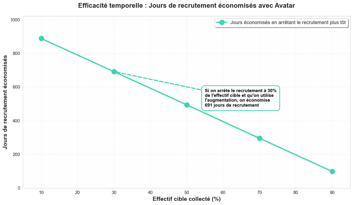 La courbe verte représente le nombre de jours de "recrutement" (collecte/labellisation) économisés en arrêtant la collecte plus tôt et en compensant par de la donnée synthétique. Le temps de génération des données synthétiques étant négligeable (quelques minutes), le gain est significatif.
